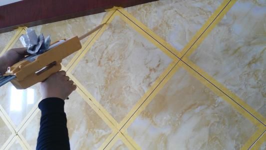 4、打美缝剂:首先拧开美缝剂装入胶枪,前30-40cm的美缝剂不要,可以先试下美缝剂效果怎么样。然后将胶枪与缝隙呈45°角均匀用力把美缝剂打入缝隙内,注意施工中一定要把瓷砖缝隙填满美缝剂。