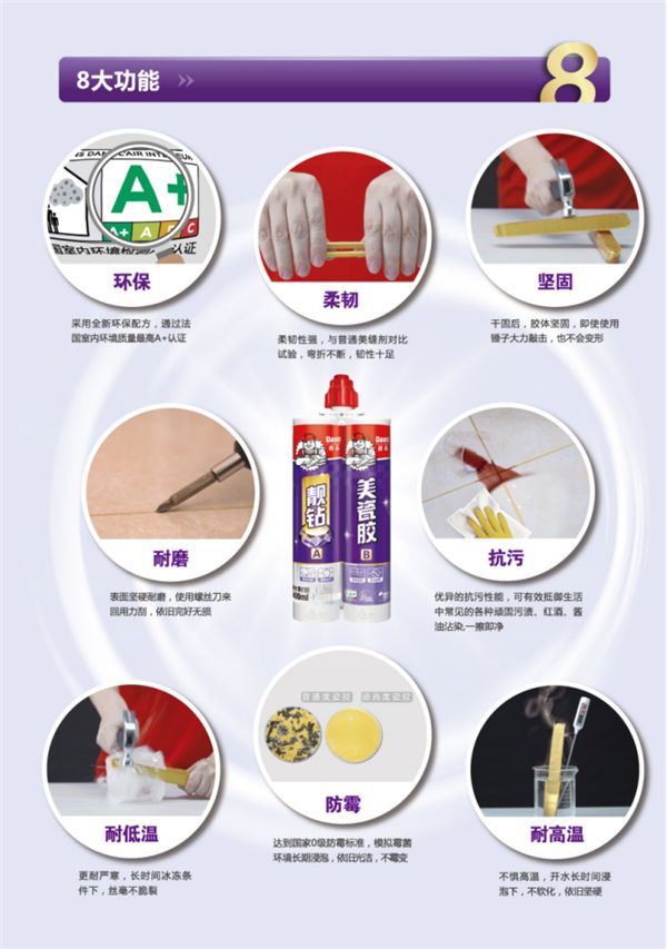 德高靓钻美瓷胶是由环氧树脂聚合物研制而成,具有绿色环保、色彩选择丰富、强效抗污、表面柔韧坚固、防水防霉、容易施工等多种优点,有效解决瓷砖缝发黑发黄、难以清洁的难题。