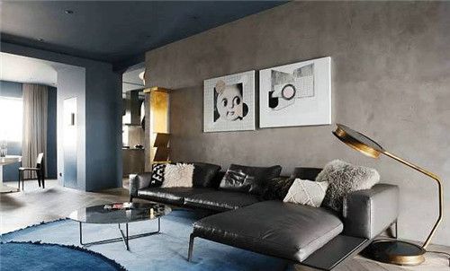 家具金属边框由宝石蓝、黑色、香槟金等冷色系颜色组合而成,颇有质感,尽显成熟本色,而吊顶、背景墙的地板拼接方式以及配色处理和灯具更显旷放与不羁。
