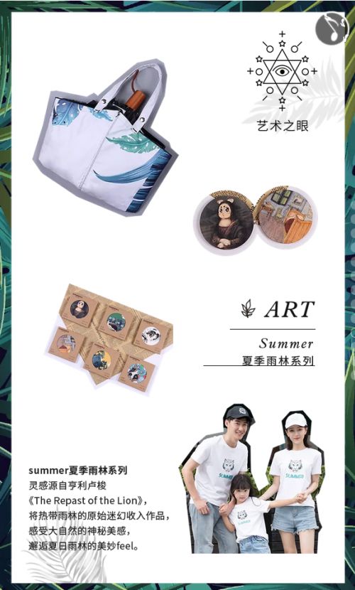 除了多款的精品家具外,喜梦宝夏季生活品系列《Summer》将强势出展,夏季雨林,灵感来自亨利卢梭的《The Dream》和《The Repast of the Lion》等作品,将热带雨林的原始迷幻收入作品,带你感受来自大自然的神木美感。现该系列产品有:手提袋、抱枕、腰枕、棒球帽、口罩、手提包伞、T恤、杯垫。