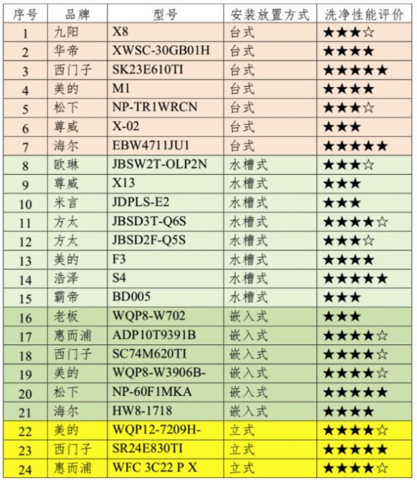 经比较,24款洗碗机中,嵌入式、立式洗碗机,比其它种类的洗碗机清洗餐具更彻底。主要原因是嵌入式洗碗机和立式洗碗机多为2层或3层碗篮,容量一般在6-14套,内部摆放空间较大,配备的喷淋臂可多方向冲刷餐具,能够进行更加充分的清洗工作。