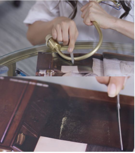 这次小月老师来做一次检测真铜的示范。小月老师使用指甲锉刀,磋磨月影铜灯的灯臂,磨出铜屑。根据小月老师的反馈,我们可以看到磨了很多碎屑,都还是金黄色的。