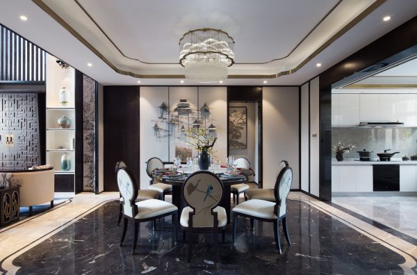 中式客厅以花鸟山水刺绣为主题规划弧形半围合布景,空间完好、丰富界面联系一起营建人文气味。整体的颜色空气创意则源于水墨画黑与白的意境转化,沙发组合间不仅重视与硬装的颜色及图案进行照应,且各沙发的原料挑选也有细微改变,以此营建不同触感,体现空间包容性。
