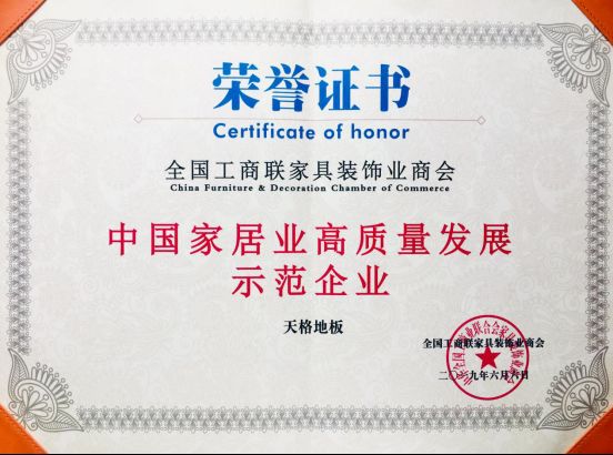 作为政府与市场的中坚力量,全国工商联家具装饰业商会在中国家居高速增长迈向高质发展的关键时刻起到了重要推动作用。而此次由其举办的“2019中国家居业高质量发展大会”,正是为了重塑行业价值体系,全方位、多层次推进家居业高质发展。在此次大会上,鉴于天格多年来只专注产销高端地材——地暖实木地板,并坚持以高品质带动高销量的原则,为千家万户带去了品质可靠、安全舒适的终极型地面建材,因此全国工商联家具装饰业商会授予天格“中国家居业高质量发展示范企业”,以示对其产品质量及品牌态度的肯定与表彰。