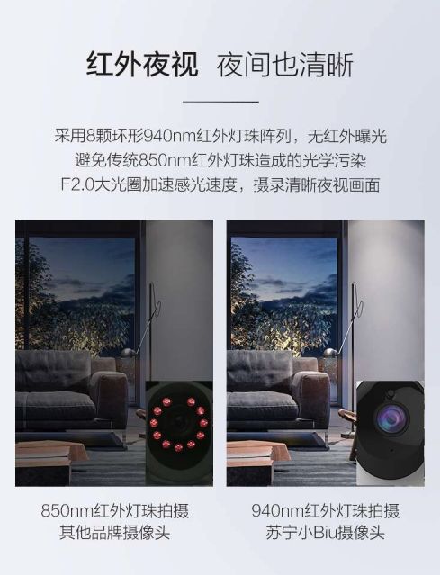 此外,苏宁小Biu智能摄像头支持红外夜视功能,采用环形940nm红外灯珠阵列,无红外曝光造成的光学污染,不仅保障了夜间的清晰呈现,也让夜间监测变得更加隐蔽,为家人带来24小的无干扰看护。