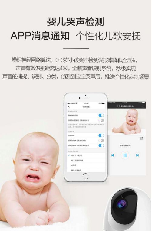 针对有宝宝的家庭场景,苏宁小Biu智能摄像头给出了一个搭载AI技术、极具人性化的设计——“婴儿哭声侦测”功能。无论是宝妈不在家的白天场景,或者是与宝宝分房睡的夜间场景,苏宁小Biu智能摄像头都能够通过卷及神经网络算法,准确侦测到宝宝的哭声,推送消息提醒到宝妈的手机,并支持自动播放儿歌对宝宝进行安抚,还可以自主设定妈妈的声音哦,是名副其实的“哄娃神器”。