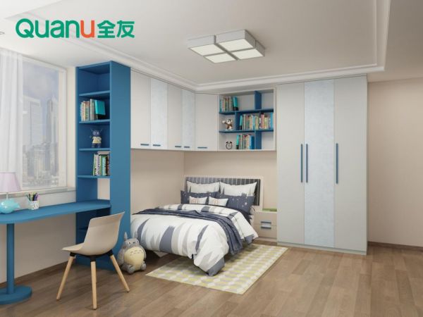 我的小主人马上上初三啦,他是个爱学习、爱整洁的好孩子。他经常在书桌前一坐就是几个小时,复习完刚学的内容还要预习新内容,还要做好多好多的练习题。书架上的书籍被他摆放得井然有序,衣服裤子也是整整齐齐的叠在柜子里,床头架子上摆放着他小时候最喜爱的玩具。我用我的实用设计,为他搭建了学习与休闲的温馨乐园。