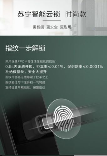 苏宁智能云锁时尚款采用瑞典FPC半导体活体指纹识别技术,可以做到0.5秒内无感开锁,拒真率小于等于0.01%;其密码开锁方式更特有虚位密码技术,具有防窥视功能;门卡开锁方式则照顾到了儿童指纹未生长完成、老指纹磨损等情况,配合APP端开启安全模式,通过两种方式组合的双重验证才能开锁,安全性能更好。