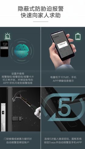 而其隐蔽式防胁迫报警功能则能在遇到危险时发出报警信息,快速向家人求助,给用户提供更安全的保障。如果门锁被撬或者暴力破坏,或被多次输入错误密码,系统都会自动发出报警信息到手机APP上,让用户第一时间获知安全隐患。