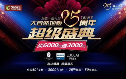 今年是大自然家居成立的第25年,大自然家居将在全国3000多家实体门店、40多个主场,联合多家知名家装品牌举行盛大的超级盛典。在盛典期间,大自然家居真情回馈广大新老客户,联合25款爆款产品进行大促活动。除此之外,在25周年庆之际,结合年度主题“我们自然生活”,聚焦年轻消费新主张,推出大自然最新地板产品“缤纷”系列。