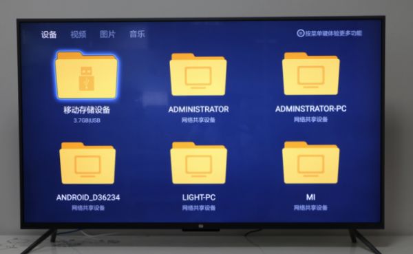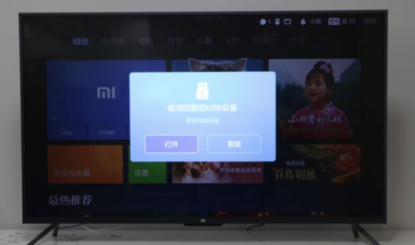 第二步:方法一将U盘插到小米电视的USB接口,系统就会自动检测出设备;方法二在小米电视主页选择【高清播放器】,找到U盘设置