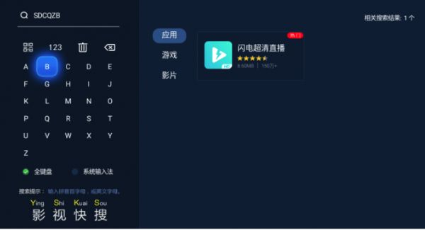 第四步:当贝市场安装成功之后,就可以下载你想下的第三方软件了;以闪电超清直播为例,打开当贝市场,搜索闪电超清直播首字母“SDCQZB”,即可找到软件图标,点击下载然后安装即可。