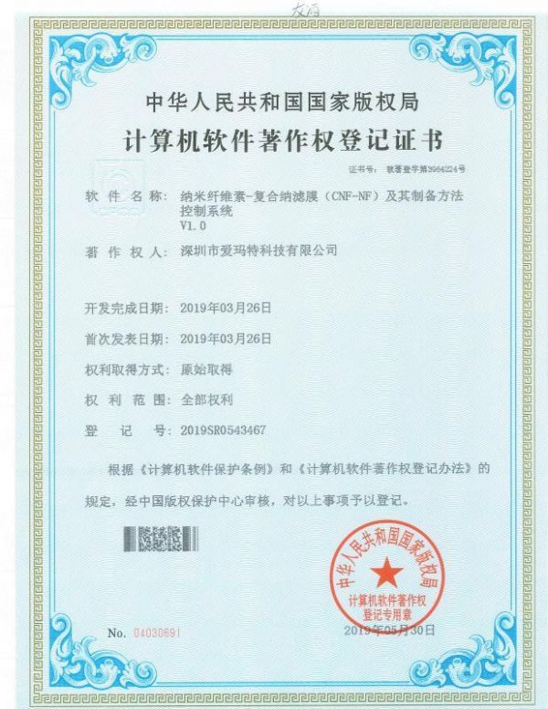 近日,根据《计算机软件保护条例》和《计算机软件著作权登记办法》的规定,经中国版权保护中心审核,始于2007年的高端型全屋深度净水品牌IMRITA爱玛特在专利技术上取得新突破,中华人民共和国国家版权局对我司提交的多壁炭纳米管—聚丙烯腊(MWCNT-PAN)复合超滤膜及其制备方法控制系统、纳米纤维素—复合纳滤膜(CNT-NF)及其制备方法控制系统的著作认定为原始取得并予以登记,从颁证之日起得到中国版权保护中心的有效保护,并依法拥有这两项技术的全部权利。