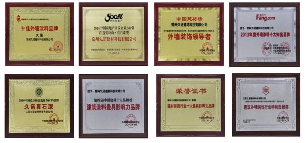 凭借卓越的品质,久诺深受行业高度认可。“建筑装饰行业十大最具影响力品牌”、“中国十佳外墙涂料品牌”、“500强首选外墙装饰系统服务供应商”、“500强装饰保温一体板首选供应商”、“中国建筑装饰百强企业”等荣誉频频加身。其中,2013年,久诺更是以令行业咋舌的姿态,成为第一家将真石漆搬上央视媒体的企业。