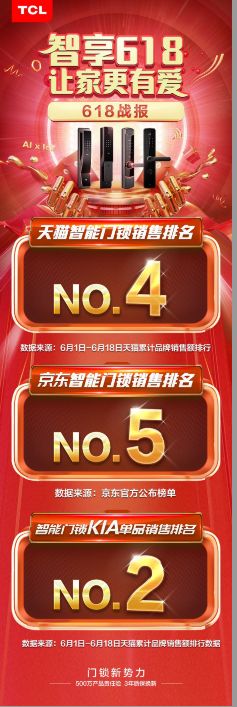 在今年的618年中大促活动期间,智能锁产品异军突起,成为各大平台销售额增长的主力军。其中,TCL物联网智能门锁销售额更是势如破竹,分别夺得了门锁K1A单品销售排名第2名,以及天猫和京东智能门锁销售排名第4名与第5名的亮眼成绩。