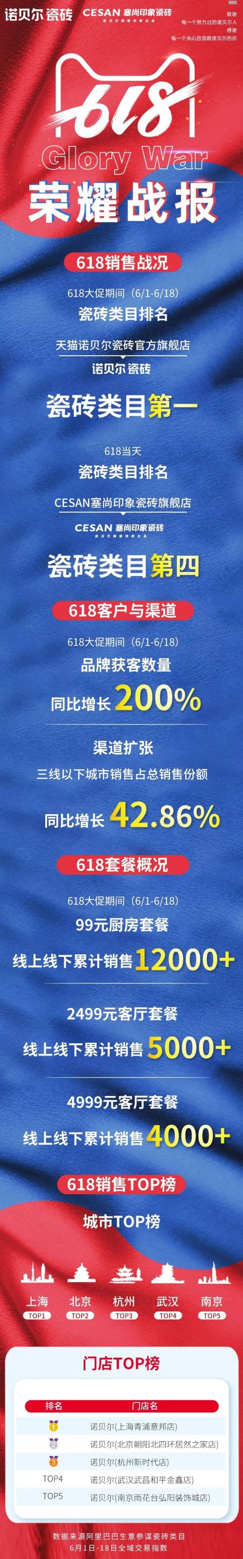 诺贝尔瓷砖品牌获客数量同比增长200%,三线以下城市销售占比总销售份额同比增42.86%;诺贝尔瓷砖上海、北京、杭州等一二线城市依然表现亮眼,入围榜单前三甲;诺贝尔瓷砖旗下塞尚印象旗舰店618当天跻身瓷砖类目第四,证明诺贝尔瓷砖渠道下沉的成功与强大的品牌号召力。