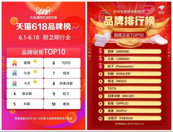 箭牌卫浴618超级战报:夺得天猫、京东双冠军,战绩再创新高!