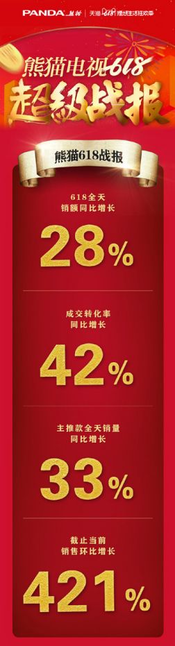 日前,熊猫电视官方公布了其在天猫的618战报,618全天销售额同比增长28%,成交转化率同比增42%,主推款全天销量同比增长33%,截止19日中午,销售环比增长421%。