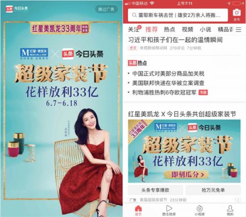 此次大促,红星美凯龙联手国内最具影响力的新闻APP之一——今日头条,凭借超级流量的导入以及IMP平台对于庞大精准流量的全场景、数字化深度运营,最终让红星美凯龙在此次33周年庆中,帮助商家展开精准的营销互动,成功赋能全行业实现更高维度的营销运营新模式。