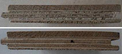 例如:从夏季到冬季地暖开启后,随着含水率下降,速生基材的收缩量只有0.15mm,如果面层材种为香脂木豆,那么它的收缩量则为2.2mm,二者相差了接近15倍。这时,表板要维持与基材同样的尺寸,就相当于被拉伸了2mm,当这个拉应力大于木材的横纹抗拉强度时,地板表板就产生开裂。通过试验发现,地板越宽越容易产生面裂,面皮越厚越易变形。所以用多层实木复合地板做地暖地板,对面层的含水率控制、地板尺寸有严格要求,市售很多标称“适用地暖”的多层实木复合地板完全达不到这些要求。