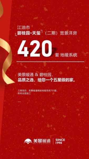 项目的施工过程中,美景暖通的设计与安装实力也得到了碧桂园的充分肯定。并直接把天玺项目三期的703套地暖系统,也直接全部交给了美景暖通来负责。