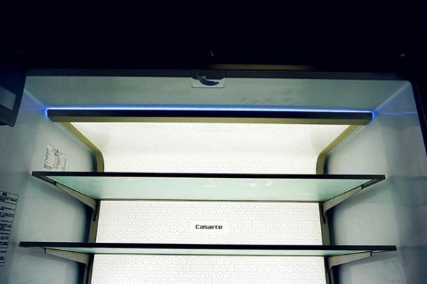 卡萨帝天成冰箱秉承了一贯大气稳重的风格,在细节处,它将弧线设计和简约美贯穿箱体内外。它的面板和抽屉把手摸起来有些弧度,减少了金属的硬朗之气,内部的搁物板和抽屉组成了流畅的曲线,冷藏区还有270度天幕面光源,极具自然美学。在外观上,它的门把手、搁物架包边、瓶座等全部采用统一的全铝包边设计,内外颜色统一,浑然天成。在内饰上,它使用一体化箱体,取消了箱体两侧的胆筋设计,悬臂式搁物架让有限的空间视野开阔,减少了空间利用率低、缝隙大、空间零碎等弊端。