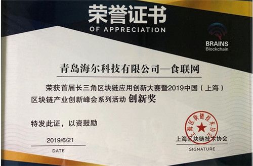 海尔食联诚信溯源平台获长三角区块链创新大赛创新奖