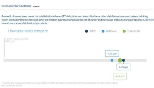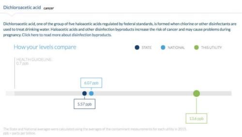 二氯乙酸Dichloroacetic acid:会增加患癌症的风险,并可能在怀孕期间引起问题。全美平均值 6.07 ppb,纽约州平均值 5.57 ppb,纽约市为13.6ppb,数值远远超出标准。