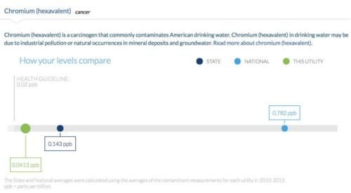 铬(六价) Chromium (hexavalent) :会增加患癌症风险,污染饮用水。全美平均值 0.782 ppb,纽约州平均值 0.143ppb,纽约市为0.0413 ppb,数值依旧高于健康标准0.02ppb。