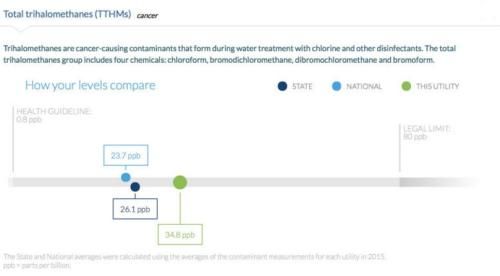 总三卤甲烷Total trihalomethanes: 三卤甲烷在用氯和其他消毒剂进行水处理期间可形成的致癌污染物。全美平均值 23.7 ppb,纽约州平均值 26.1 ppb,纽约市为 34.8ppb。