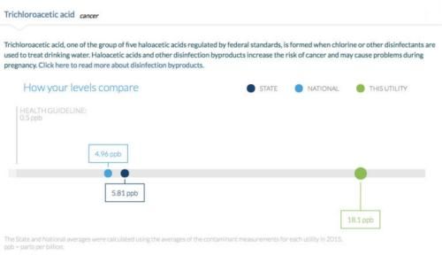 三氯乙酸Trichloroacetic acid: 这是一种在饮用水中检测到的消毒剂,会增加患癌症风险,并可能在怀孕期间引起问题。全美平均值 4.96 ppb,纽约州平均值 5.81ppb,纽约市为 18.1 ppb。数值超出平均值。