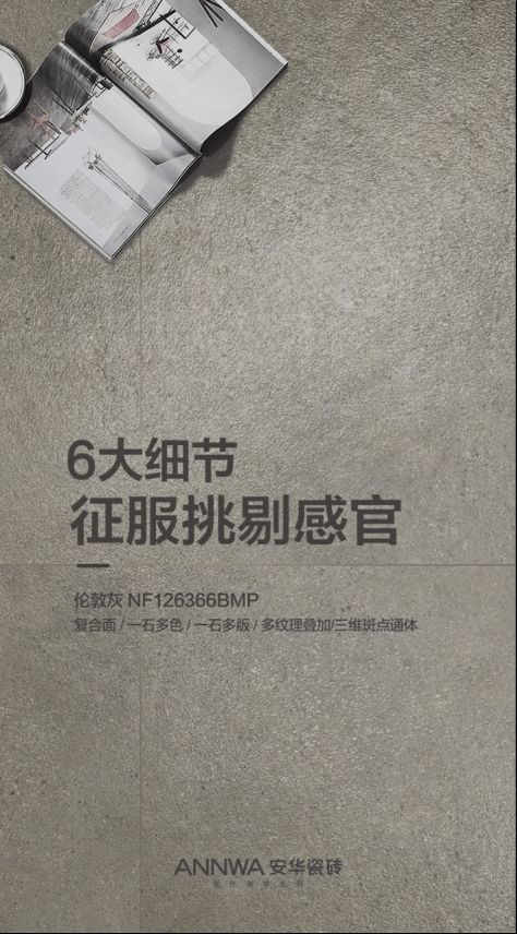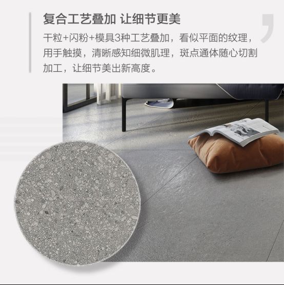 工艺主要以精细的复合面为主,独特的工业水泥+水磨颗粒两种纹理元素智能叠印,纹理与质感,形神兼具,而且在砖面增加闪粉技术,能达到15°雅光的光感,极具韵味。整个系列有35°灰、55°灰、75°灰适合于各种场合应用,延伸到有质感的生活,也是现代人所追求的。