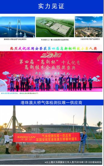 深国安凭借卓越的品质和完善的售后服务,不仅是华为无线气体检测仪的唯一供应商,港珠澳大桥气体检测仪项目的唯一标的方,同时还是中石油、中石化、中海油、中国航空工业集团、中科院、中电集团、中化集团、中电投、东风日产、华为、比亚迪、富士康、中兴、小米、VIVO、德国巴斯夫、美国可口可乐等世界500强的长期合作伙伴;除畅销国内23个省市自治区外,还远销中东、印度、日本、新加坡、欧盟等20多个国家和地区、受得客户一致好评;