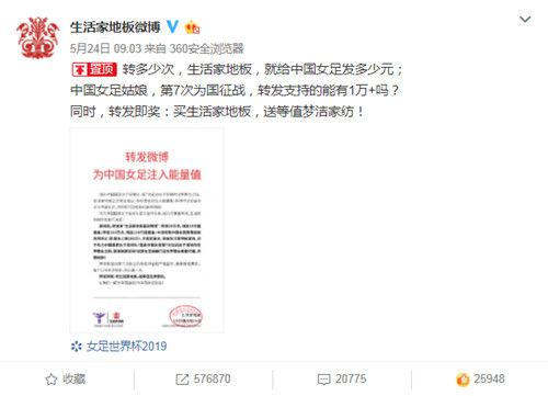 这是中国女足官方合作伙伴——生活家地板发起的助力中国女足征战世界杯行动,借以“发奖金”为由,旨在让更多人关注中国女足世界杯赛事。截止活动结束,转发量达到57万+,阅读量突破2.1亿。