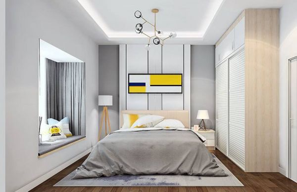 这款卧室看起来非常的清爽干净,主色采用灰色+白色+咖啡色打造而成。简约不代表简单,不仅仅是简单的“堆砌”和平淡的“摆放”。床头背景墙采用局部护墙板设计,看起来更加高档。撞色装饰画,让整个空间瞬间明亮起来,凝结着设计师的独具匠心,既美观又实用。