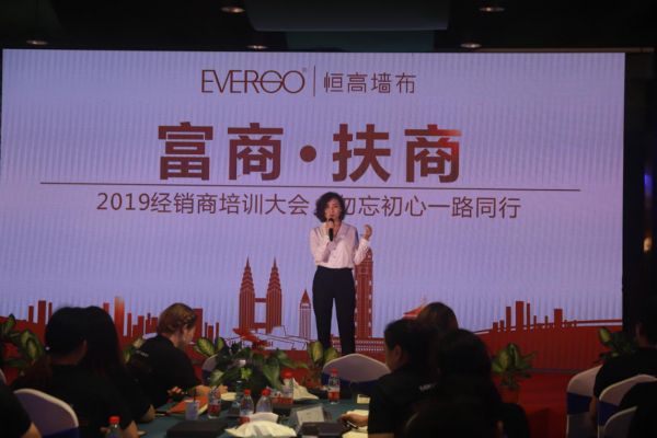 为了让新加入恒高大家庭的经销商们更了解恒高,市场总监郭琦为大家介绍了恒高的产品优势及工艺特点。世人皆知布遇水则潮遇火则燃,作为新工艺专家,恒高今年更新了技术,使墙布同时具有了“防水防火”的功能,在谈及恒高的特色工艺:颜色因光源而多彩,肌理因角度而多姿时,对于这一特殊工艺,与会者纷纷称奇,再次为恒高的产品折服。郭琦也深入为大家带来了恒高十七道生产工序的讲解,展示了恒高的自主研发能力,众经销商也更加期待恒高的未来。