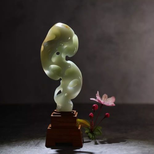 此外,大多数沙枣青都附着有皮色,其皮色多以黑红皮为主,色泽润透浓郁。一件成色好的沙枣青作品,需要具备细腻的玉质、油润的触感、品相端正的色泽,这三者的统一,方是成就沙枣青玉种的黄金三角。从结构上看,鸭蛋青和沙枣青结构都很细密,并且不泛油性,两种料子的脂粉度也都很好;