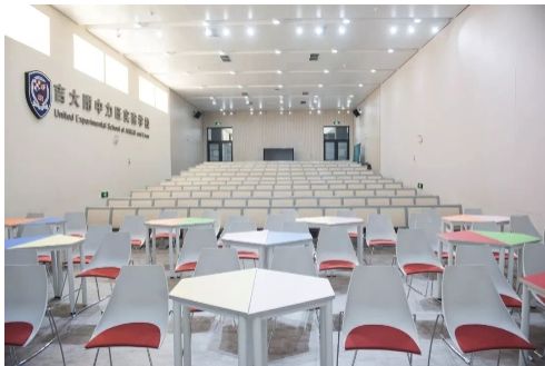阶梯教室座位设有层层落差,后方的听众不会被前方遮挡。阶梯教室整体对称统一,显得庄重大气,主墙上印有学校名字,象征着学校底蕴深厚。