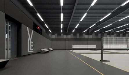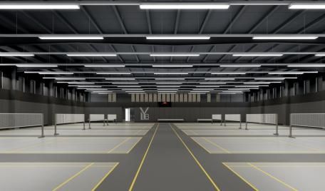 整个羽毛球馆的设计中,场地占据了绝大部分的空间,场馆的顶部保留了原有建筑的轮廓,既增加挑高也扩大视野。14块场地都符合国际大赛的标准,整个场馆高12米,确保了球场上空9米、球场四周2米以内无障碍物,保证了运动员在运动过程中不受干扰。在满足羽毛球场地技术的要求上,邵沛打破了传统绿色场地的刻板印象,在空间颜色上大胆采用黑白调来处理,并用黄色来标记球场界限,邵沛认为色彩的对比使整个空间具有稳定且运动感的空间倾向,增加了整个空间的张力。