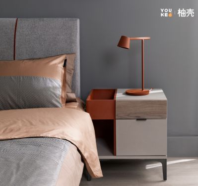 在材质选择上,HT系列时尚颜值卧室家具可谓是十分讲究。不同于市面上常见的高光或哑光材质表面,HT系列产品材质表面采用浮雕暗纹处理,工业风的硅藻泥肌理质感与指尖上的细腻触感完美交融,让材质的独特魅力与简约风格完美融合;拼接灰榆木板材则采用木纹肌理,实木级触感细腻自然,不繁复、不张扬,在最细小的地方保证卧室空间家具的品质感。
