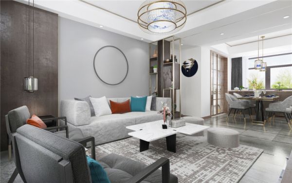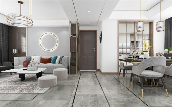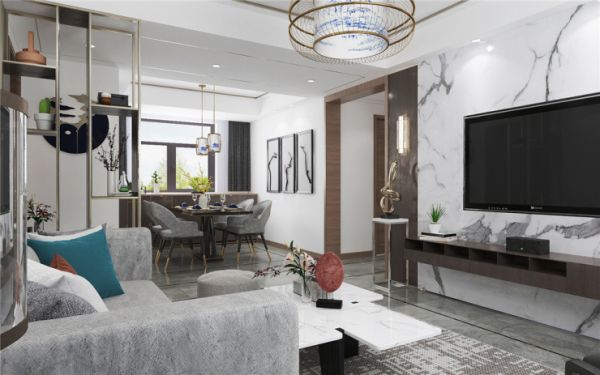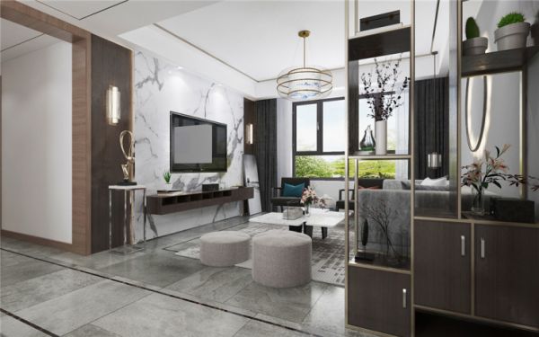 现代中式风格不是纯粹的元素堆砌,而是通过对传统文化的认识将现代元素和传统元素结合在一起,以现代人的审美需求来打造富有传统韵味的事情,在总体布局方面尽量满足业主的生活需求,主要装饰材料以乳胶漆,地砖,金属条,软装等来构造,来创造出一个温馨、健康的家庭环境。在功能方面 ,客厅电视背景墙以储物和美观相结合为主,有储物柜可以增加储物功能,再用大理石做造型,实用大气。在色调上使用木色和金属搭配,加以橘色做点缀,一些造型线条的运用和金属的质感,加上暖暖的灯光,使空间更有层次感。低调而不简单,而又时时刻刻的彰显着个人的魅力与特点。