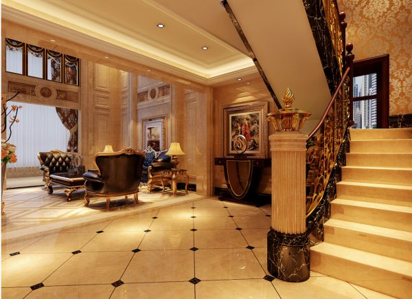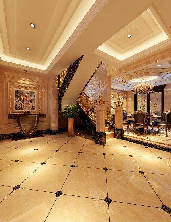 过厅及楼梯间,同样使用了金色与黑色的对比,强调奢华,地拼及吊顶没有做的过于复杂,避免过于抢眼,因为这个空间是服务于客餐厅的。