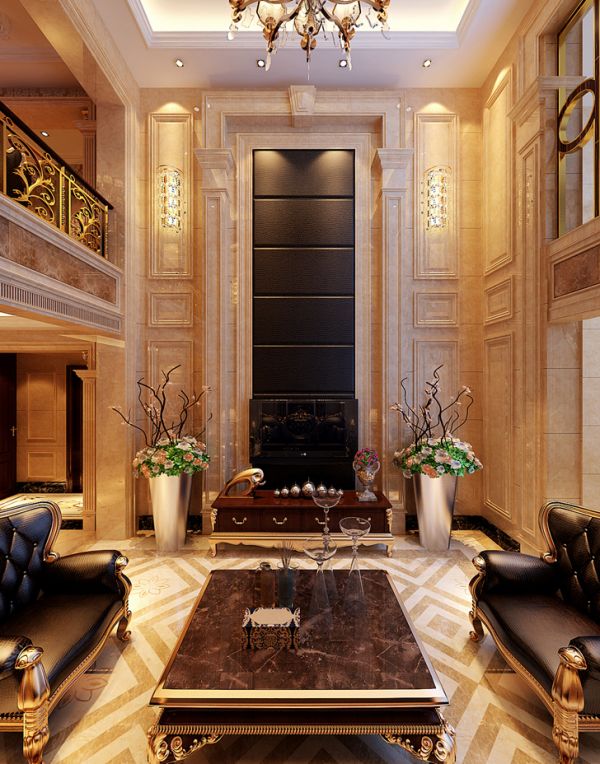 客厅有较高的挑空空间,使用石材的墙面造型及柱式,强调向上感,使空间显得奢华且具有威严感,几何形式的地面拼花既显得现代又不失稳重大气。