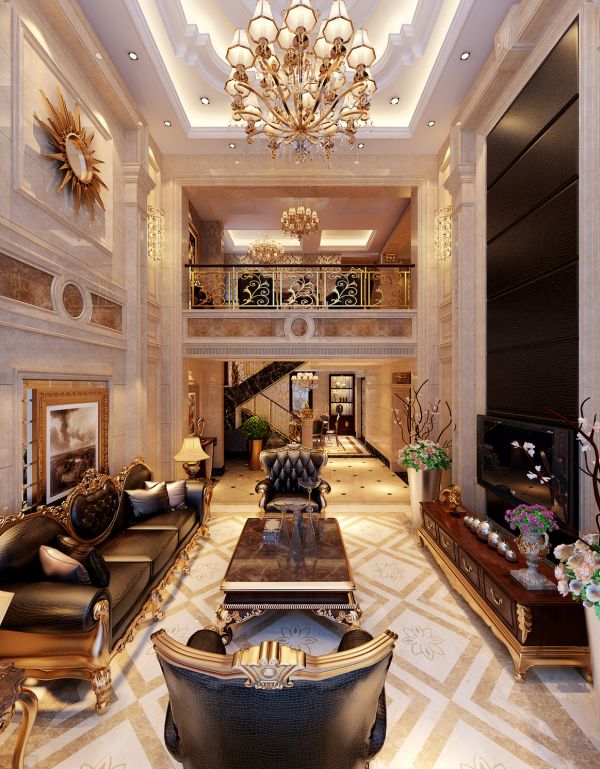 可以看到客厅的全景,二层的平台、楼梯间以及一层的过厅部分,客厅三面墙同样的处理手法使得客厅的装饰和谐统一,金色的二层平台护栏极具奢华感。