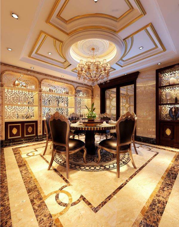 餐厅使用了深色木制与米色石材的搭配,加以描金的处理同样是为了体现豪华感,镜面磨花的处理使得空间具有了延伸感,地拼的造型中心圆形部分与顶面的中心的圆形部分协调一致,同样也正是餐桌所处位置。
