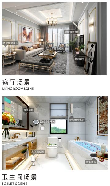 智能墙壁开关,关联场景,语音控制,灯具一键掌控;万能遥控器,随心所欲,一举控制所有红外功能电器;智能窗帘电机,窗帘自动开合;人体传感器的应用,使得人来灯亮、人走灯灭,省心省电,更人性化;智能魔镜,时间显示、温度显示、触控灯光、除雾功能,一目了然;还有智能音响、智能指纹锁、智能摄像头、燃气报警器、智能插口等,高科技诠释高品质家居生活新体验,“蔚来”智能家居系统,引领行业“芯”未来。