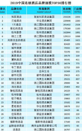 2019中国连锁酒店规模TOP30 亚朵位列15都市花园升至16