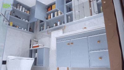 马桶侧边柜,推拉门设计,敞开区与封闭区可以灵活变换,同时解决高频使用与隐私收纳的需求。