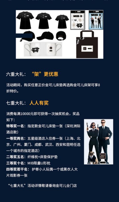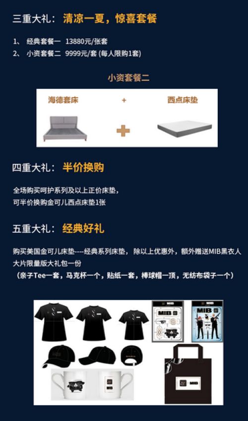 好马配好鞍,有了金可儿床垫怎么能少得了一个好床架呢?只要购买任意正价金可儿床垫,再选购金可儿床架就享8折特价!当然,如果床架你已经有了,只购买一张床垫,金可儿也送“礼”!购买金可儿经典系列床垫,享受以上优惠外,还额外送你MIB黑衣人限量版大礼包,喜欢科幻大片《黑衣人:全球追缉》的朋友千万别错过!