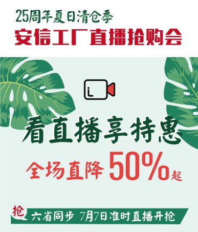 打游戏直播了,吃东西直播了,淘宝天猫直播了,安信地板也开始直播了!安信地板25周年,年中钜惠全国巡回网络直播抢购大会将于7月7日登陆西北六省。陕西、甘肃、宁夏、青海、西藏、新疆联合华中地区河南省。7省联合大促,百款地板产品,超值工厂价格,以飨客户。没有大动作,怎敢惊动您!要问地板最低多少钱一平方米,惊到您不可思议,7月7日关注就知道!